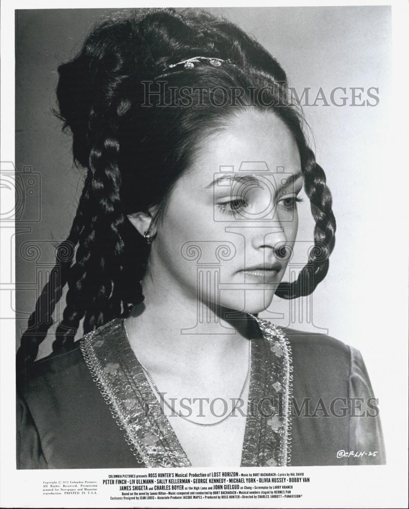 This is an original press photo. Actress Olivia Hussey stars in Columbia Pictures "Lost Horizon," with Peter Finch, Liv Ullmann, Sally Kellerman, George Kennedy, Michael York and Bobby Van.Photo measures 8 x 10inches. Photo is dated --1972.